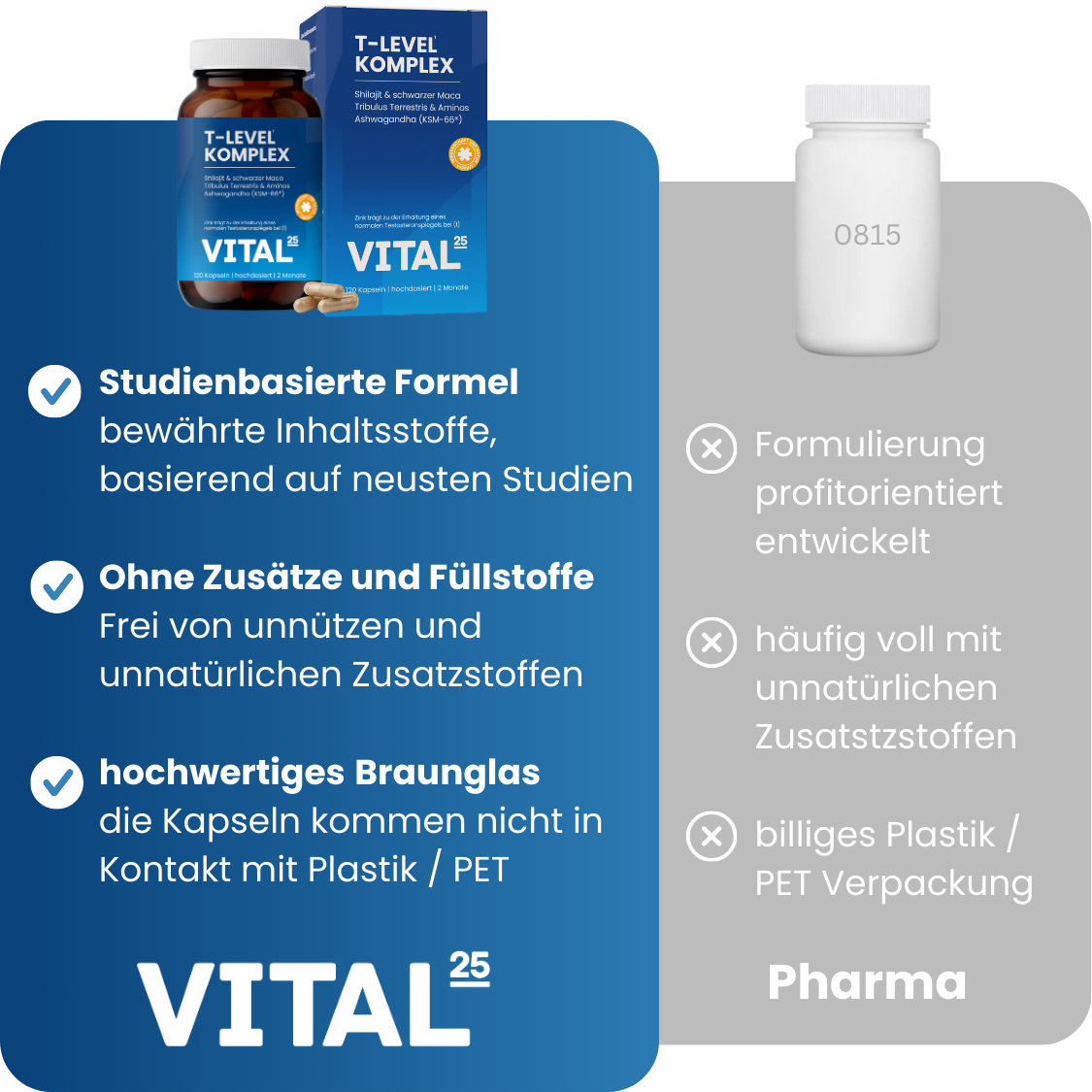 In der Pharmaindustrie geht es um schnelle Profite, darunter leidet die Qualität der Produkte. Typischerweise voll mit unnützen Füll- und Hilfsstoffe, in billigen Plastik verpackt. Mit Vital25 gehen wir einen anderen Weg und setzen auf natürliche Inhaltsstoffe, verpackt in einem hochwertigen Braunglas. Wir vereinen damit das Beste aus Natur und Wissenschaft.
